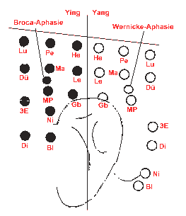 Tacke za Aphasiu su na ovom mijestu demonstrirane, iako nisu Y-tacke, zbog njihove pozicije.Posebno je interesantno, da se Broca-aphasie preko Yin-tacke, a Wernicke-aphasie preko Yang-tacke terapira.